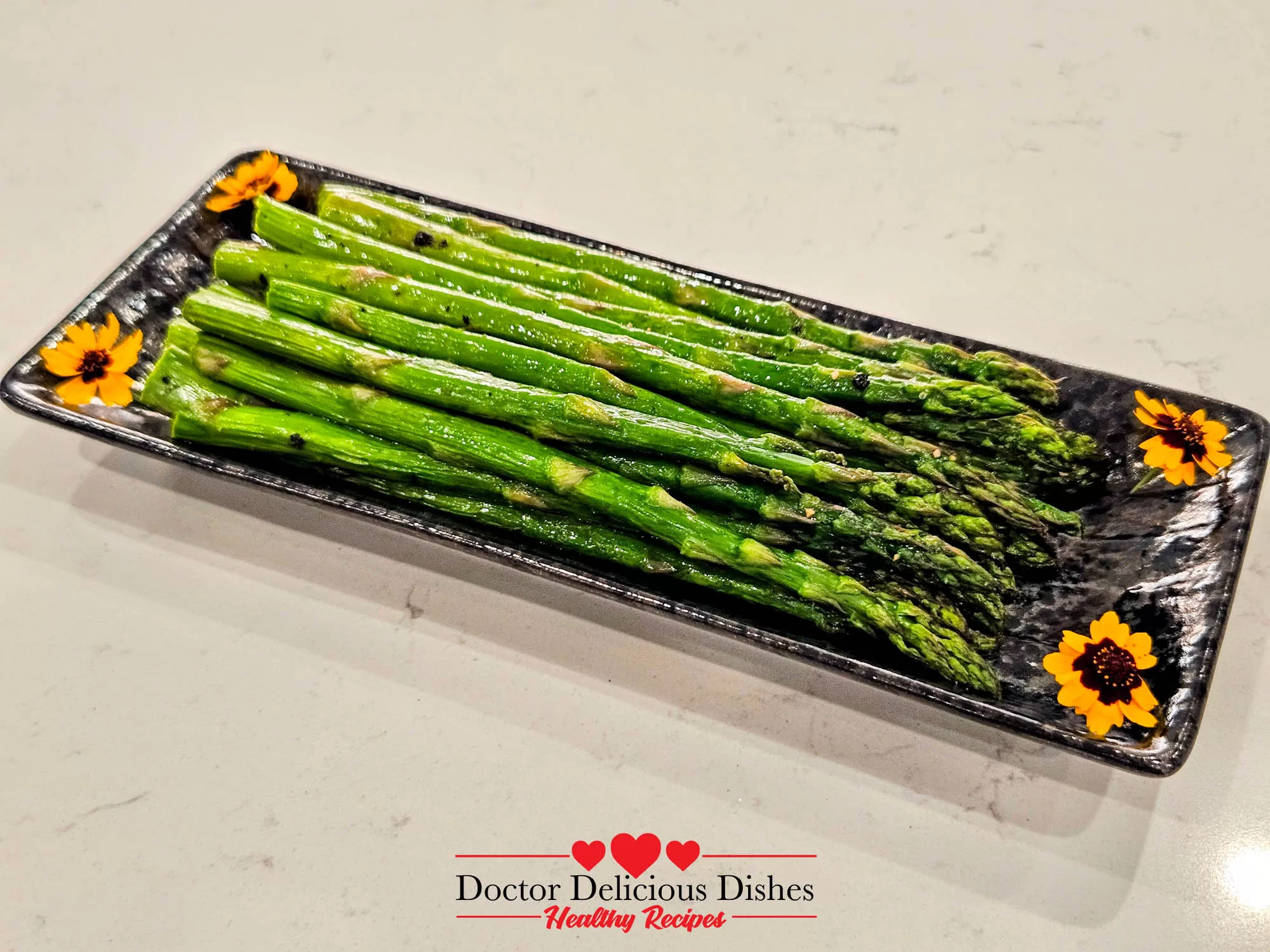 Cooked Air Fryer Asparagus plated on a black floral dish, ready to eat.