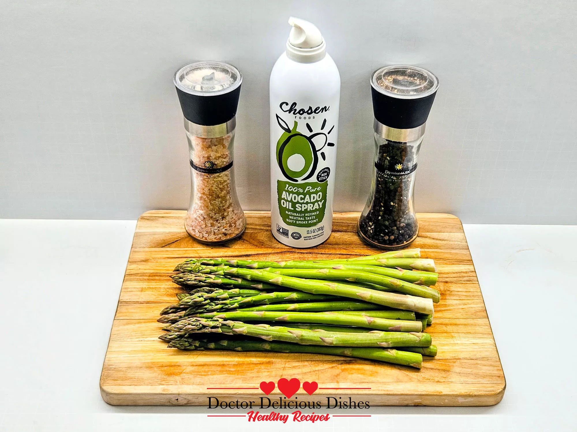 Start by grabbing everything you need: fresh asparagus, avocado oil spray, salt, and pepper. Keep it simple and delicious!