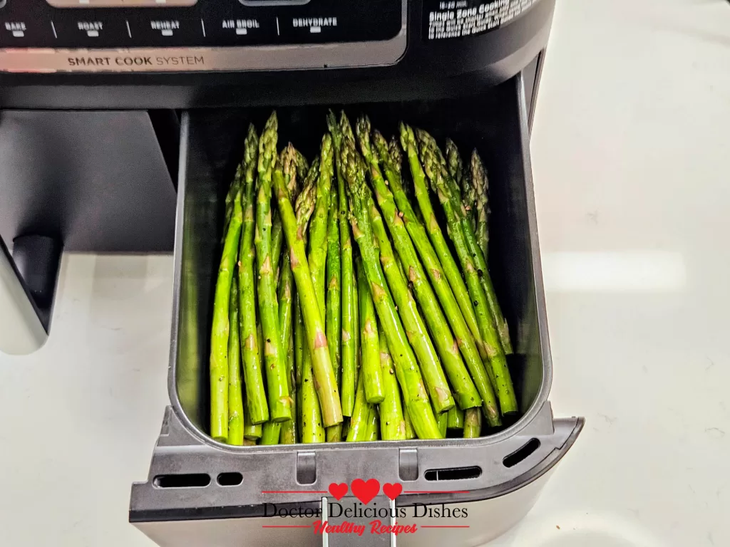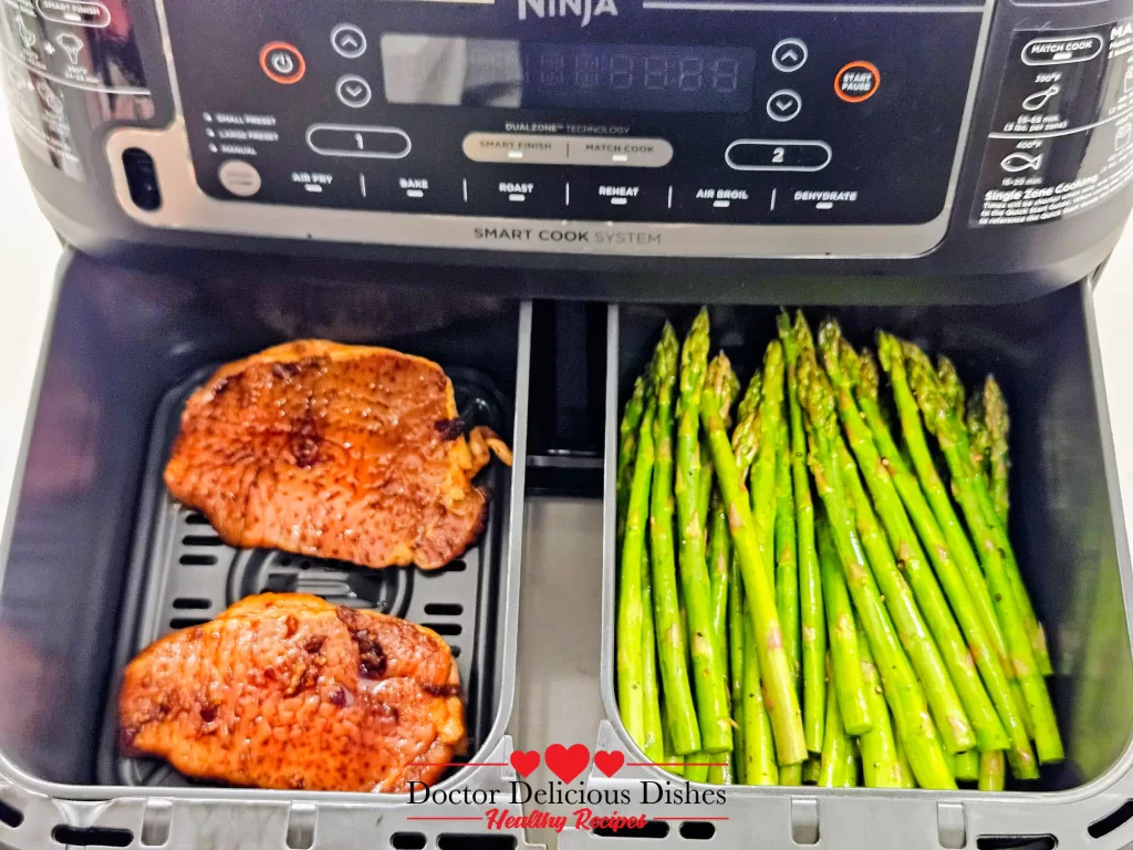 Place the seasoned asparagus into one basket of your Ninja air fryer. If youβre making Air Fryer Pork Chops, add them to the other basket for a perfectly timed meal!