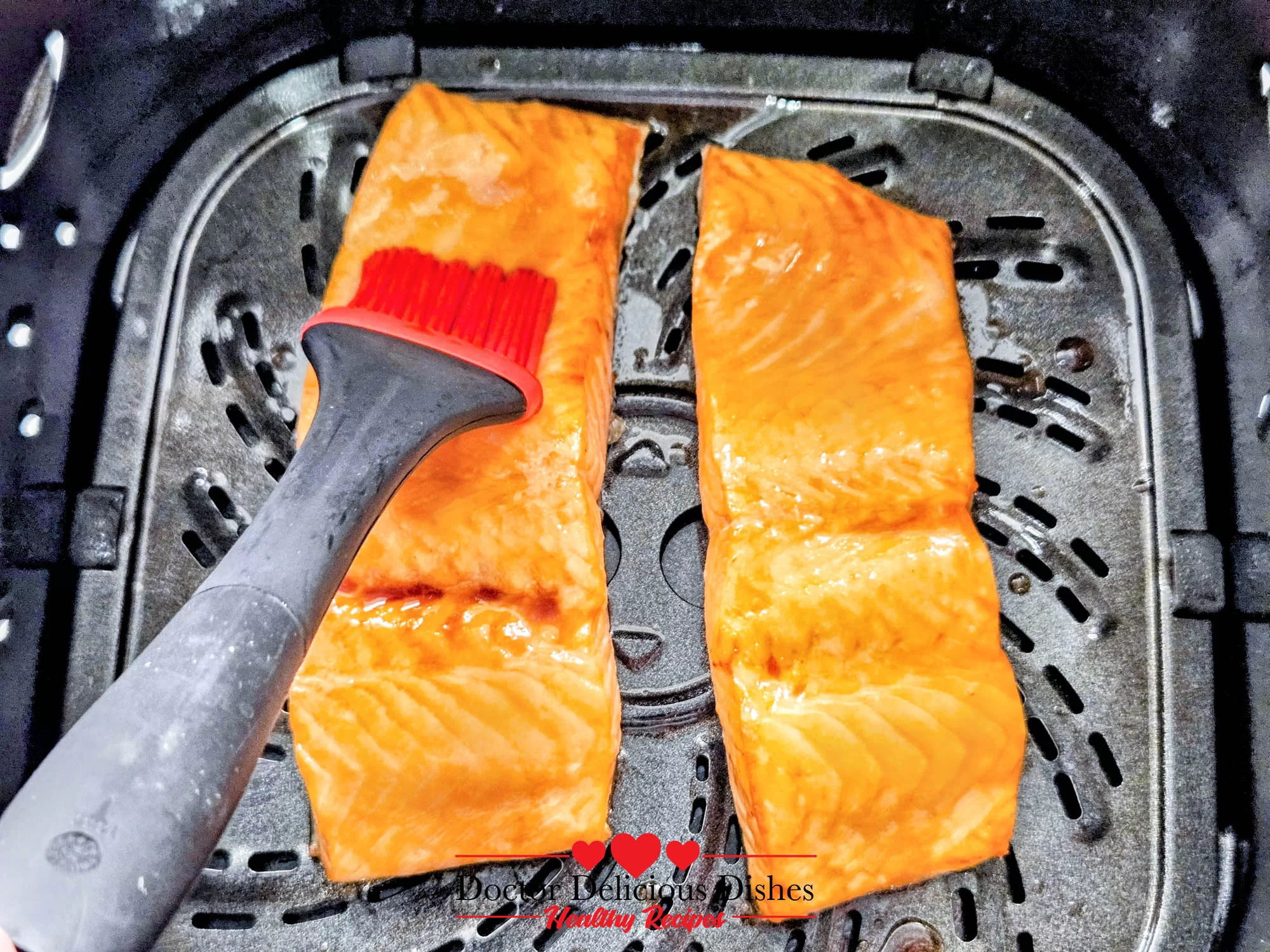 Brushing teriyaki glaze onto salmon in the air fryer for glossy Teriyaki Salmon.
