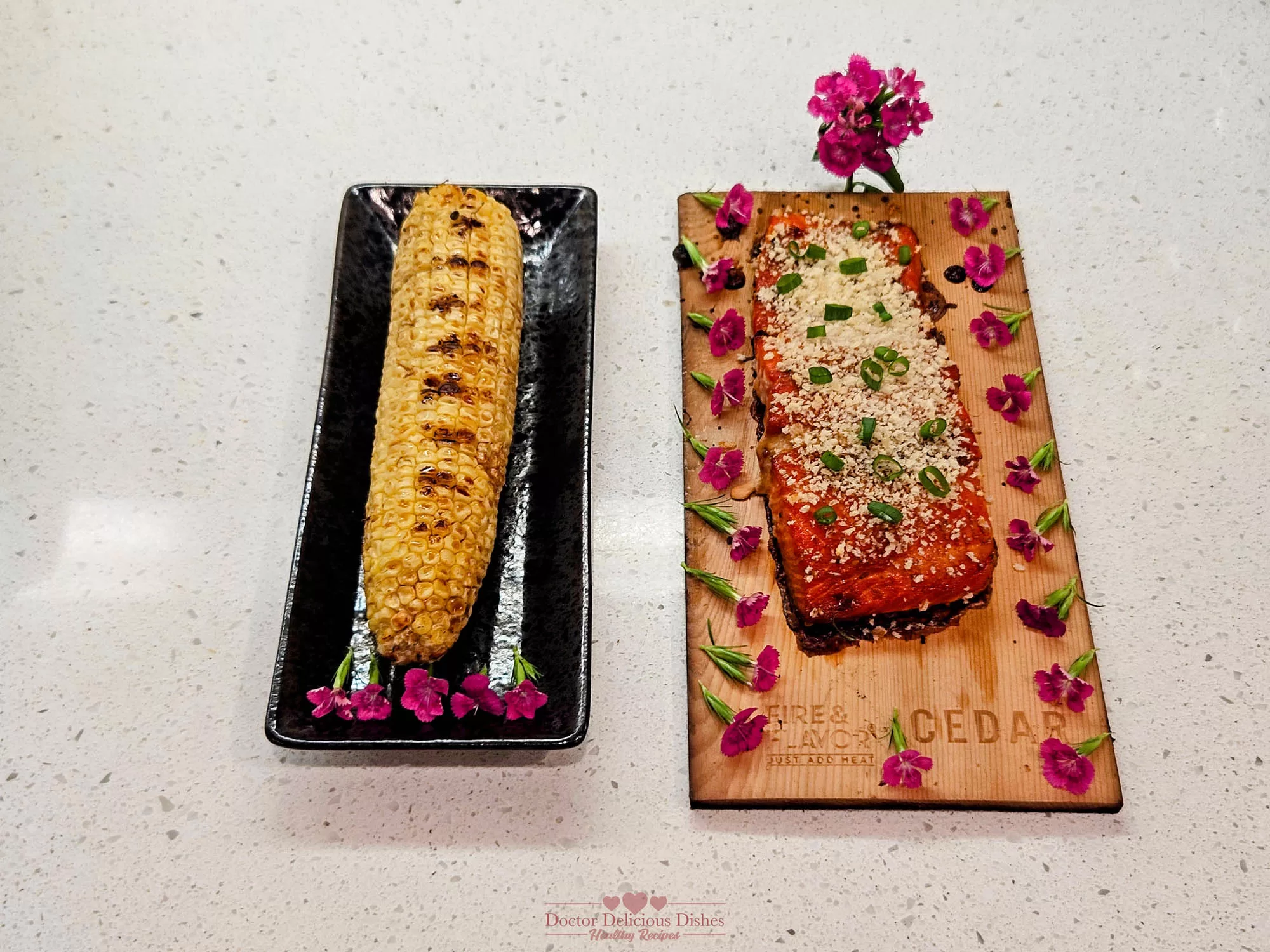 Carefully remove the grilled cedar-planked salmon and the grilled corn from the grill. For an elegant presentation, serve the salmon directly on the cedar plank, garnished with chopped green onions and a sprinkle of sesame seeds if desired. Place the grilled Japanese-style corn on the side, either whole or cut into halves. Add a few edible flowers around the plate for a touch of color and elegance. Serve immediately and enjoy!