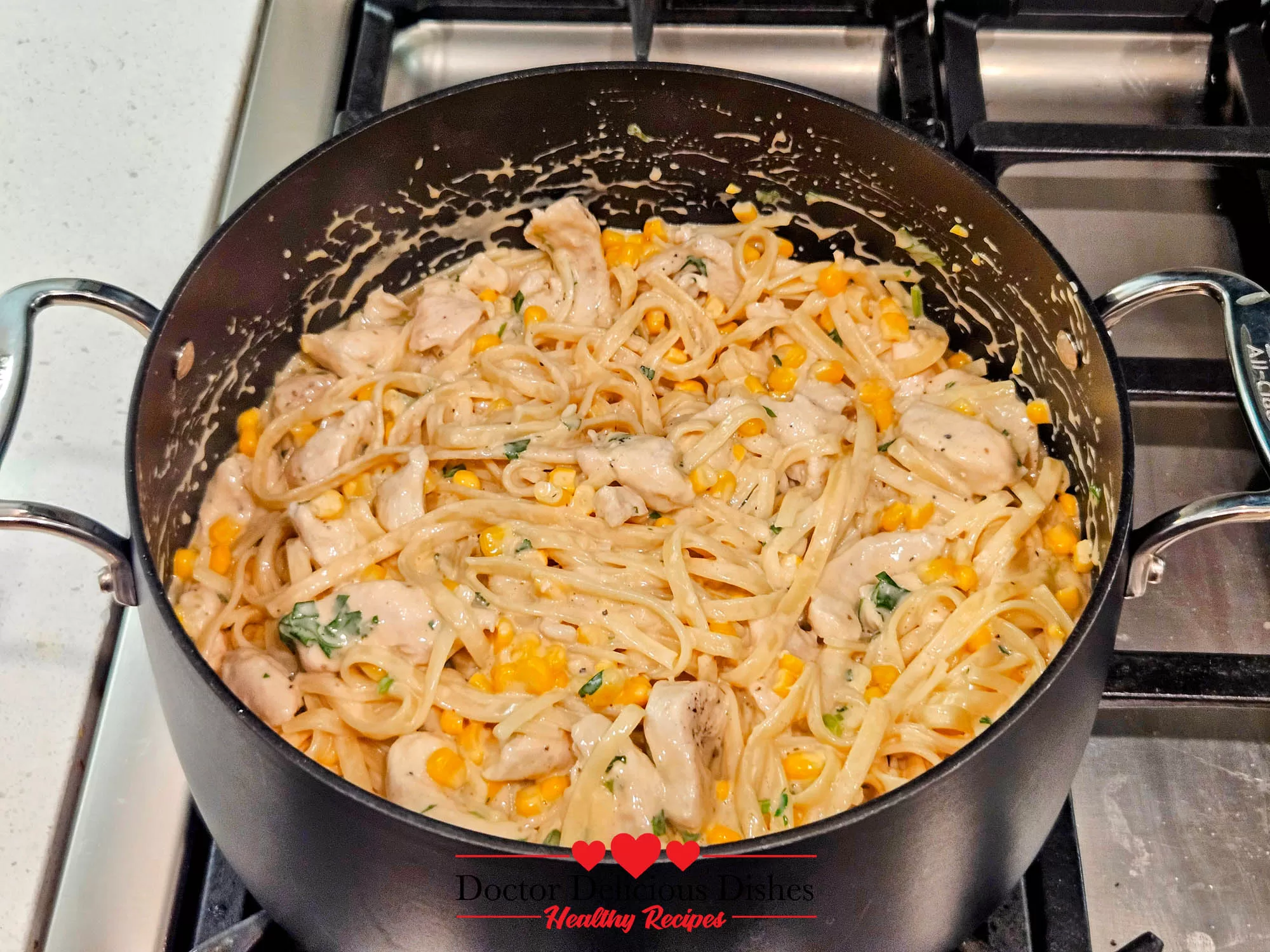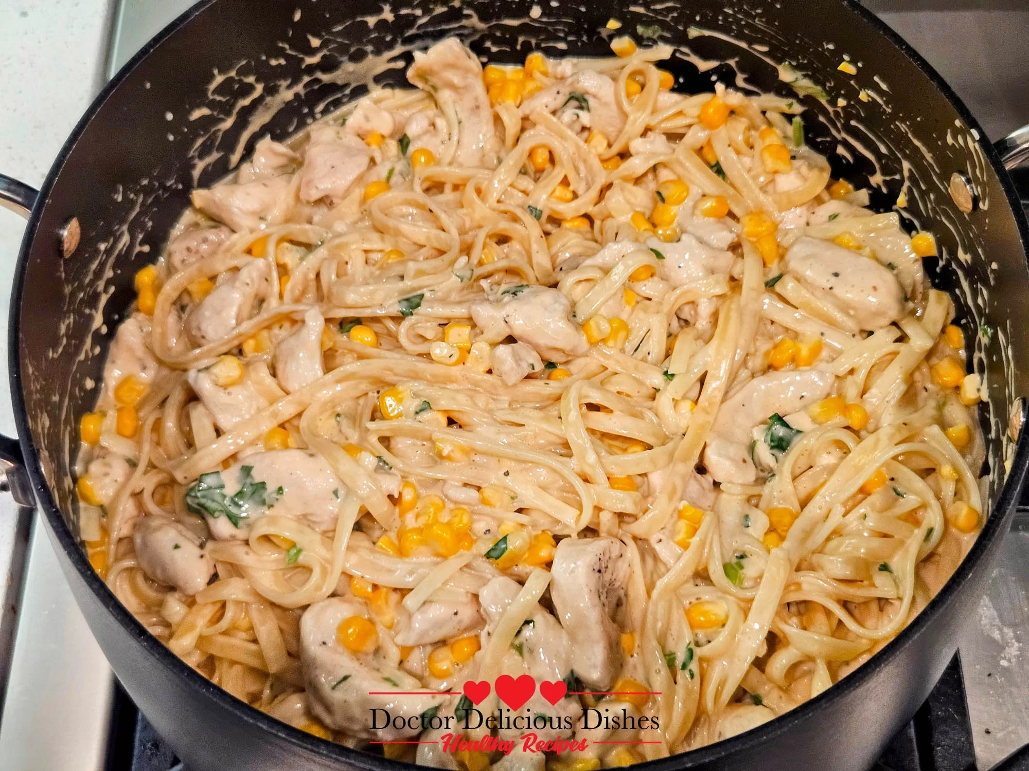 I dreamed up this particular combination on a super-busy Tuesday, when my fridge was practically empty and my family’s appetite was off the charts. I had two lonely chicken breasts in the freezer, some forgotten frozen corn (which turned out to be a sweet-and-salty marvel 🌽), and a jar of Rao’s jar Alfredo sauce.