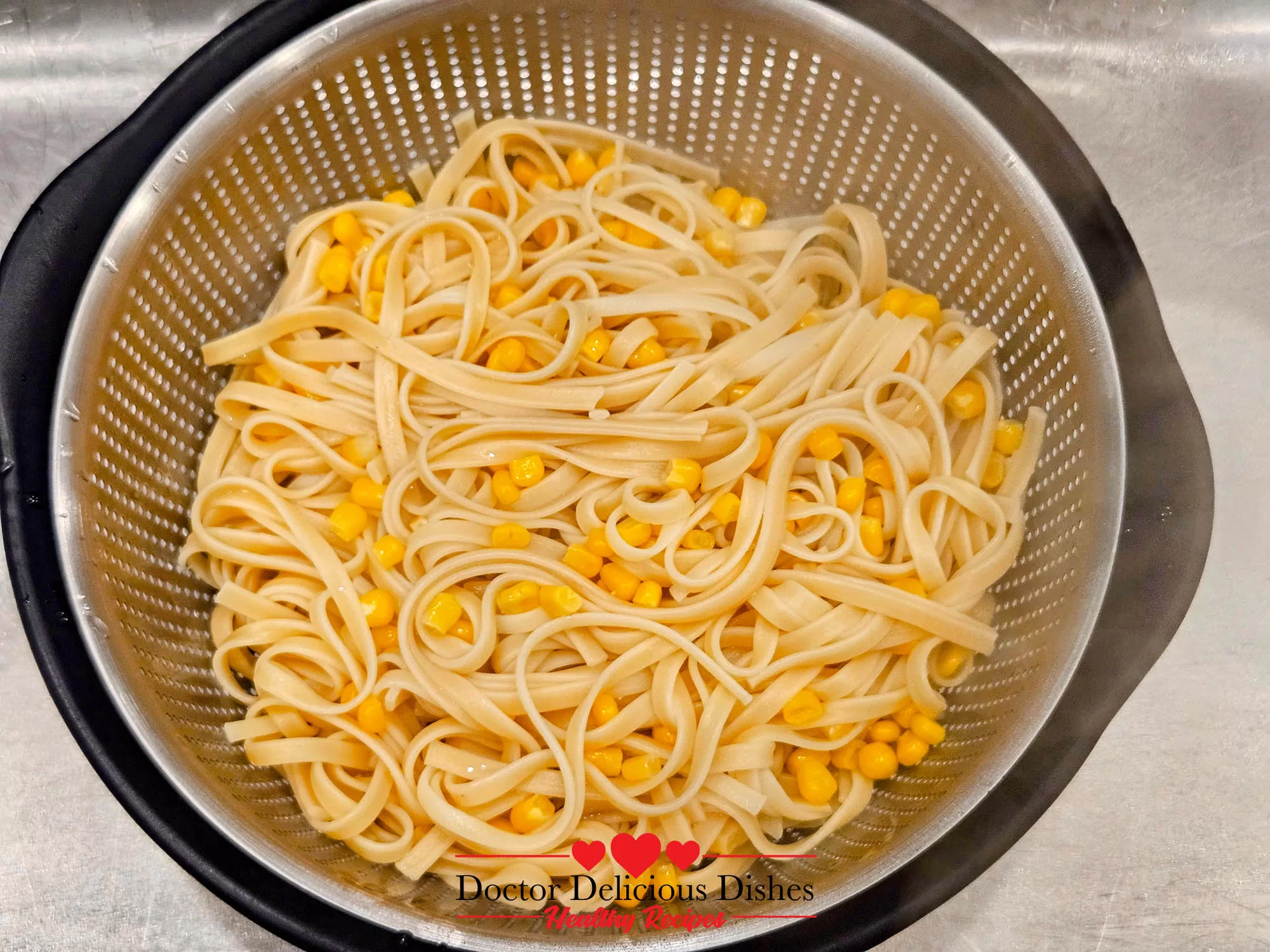Freshly cooked pasta and corn in a colander, ready to be combined with Alfredo sauce and chicken for a Chicken Alfredo Recipe with Jar Sauce.