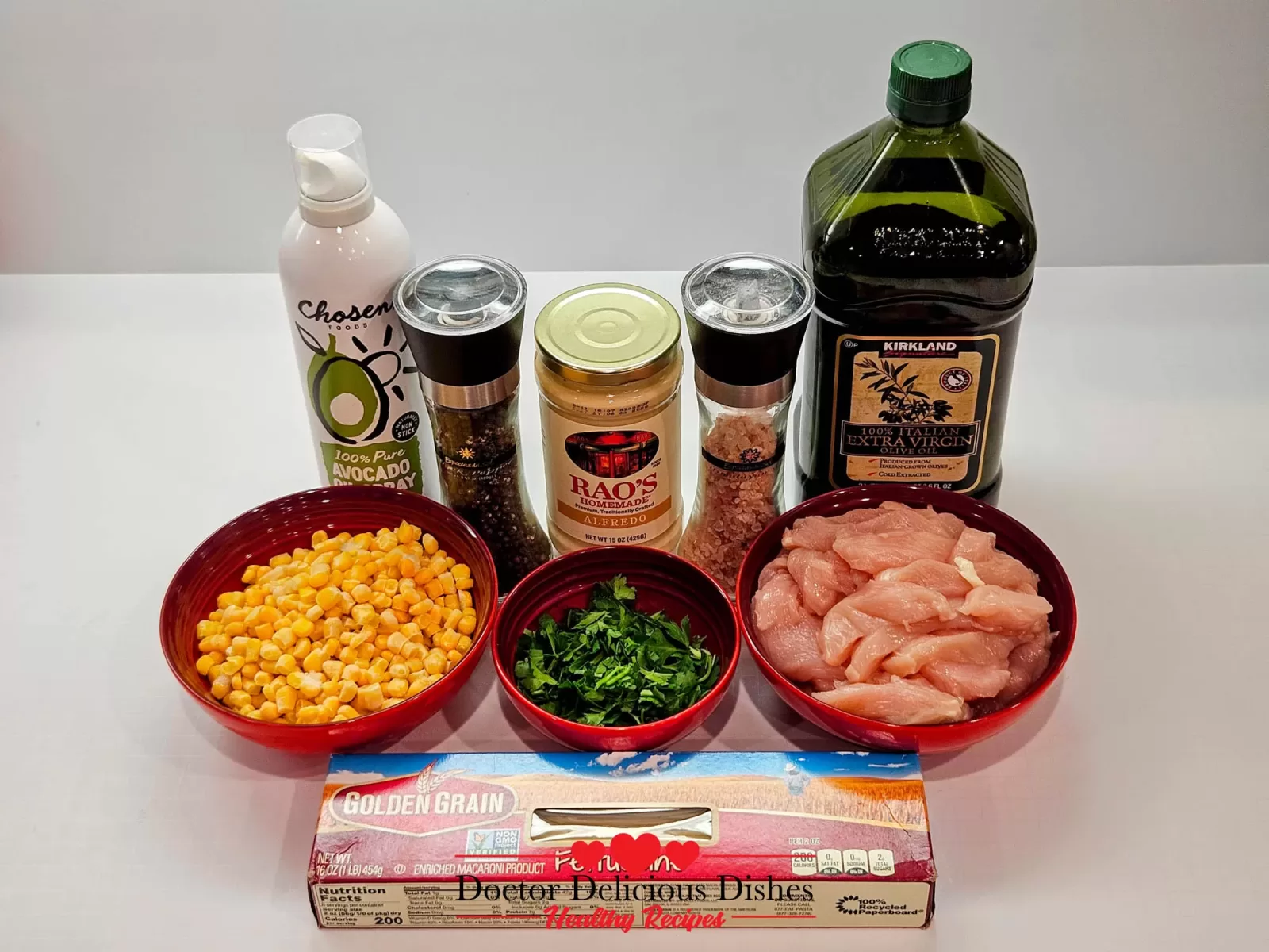 All the ingredients for a Chicken Alfredo Recipe with Jar Sauce displayed on a counter, including pasta, raw chicken, corn, cilantro, alfredo sauce, cooking oils, and seasonings.