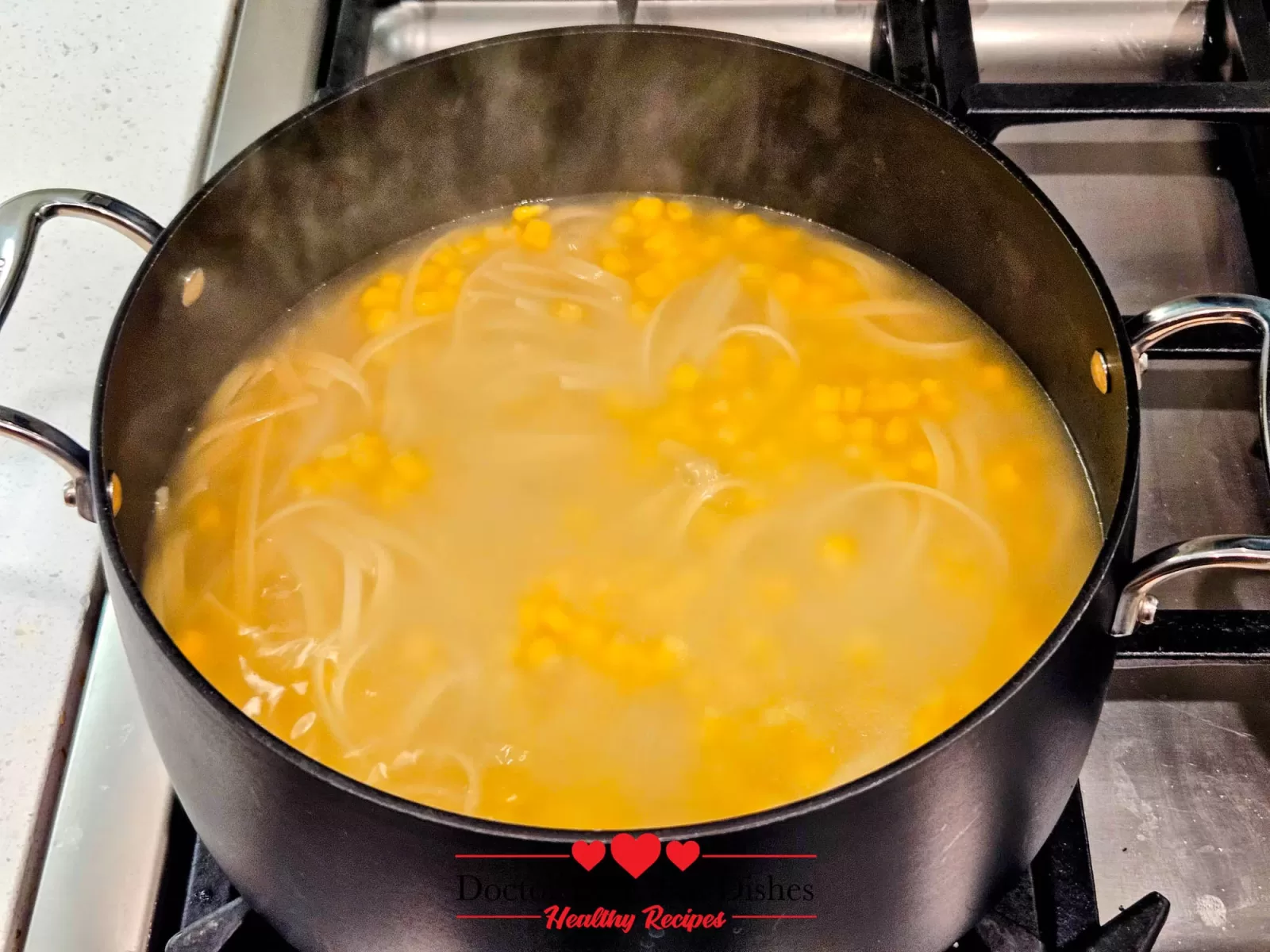 Pasta and sweet corn kernels bubbling together in the pot for a Chicken Alfredo Recipe with Jar Sauce.