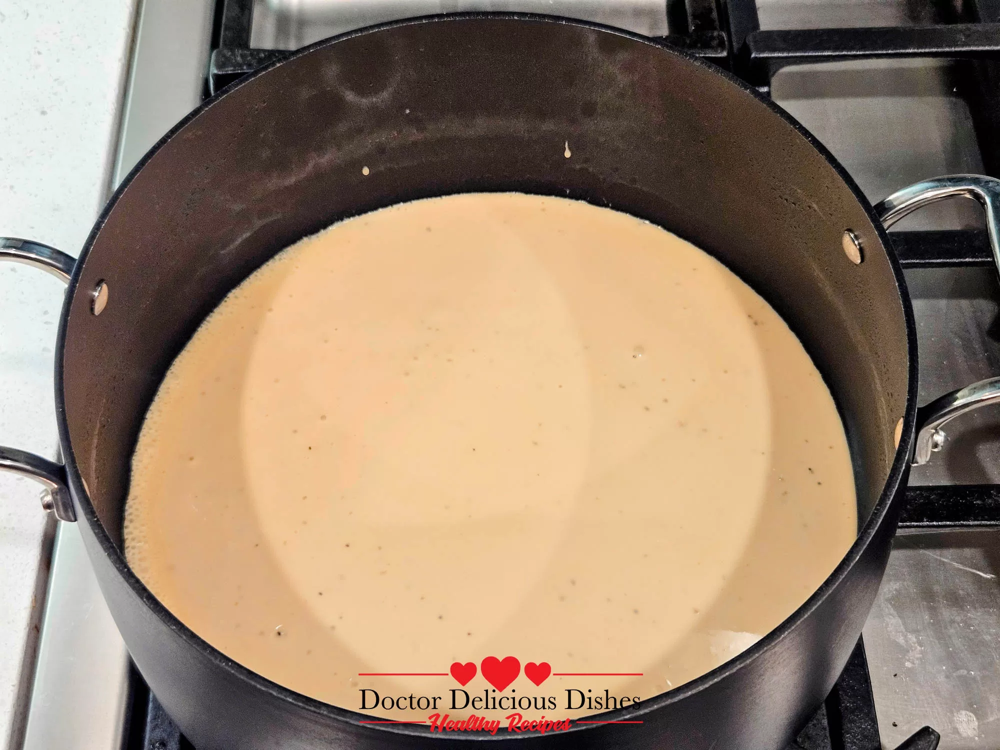 A pot of creamy jar Alfredo sauce gently warming on the stovetop for a Chicken Alfredo Recipe with Jar Sauce.