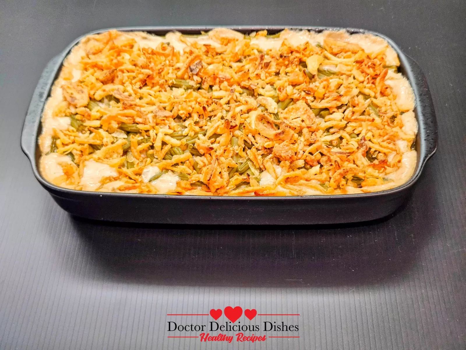 Freshly baked green bean casserole recipe topped with golden crispy onions