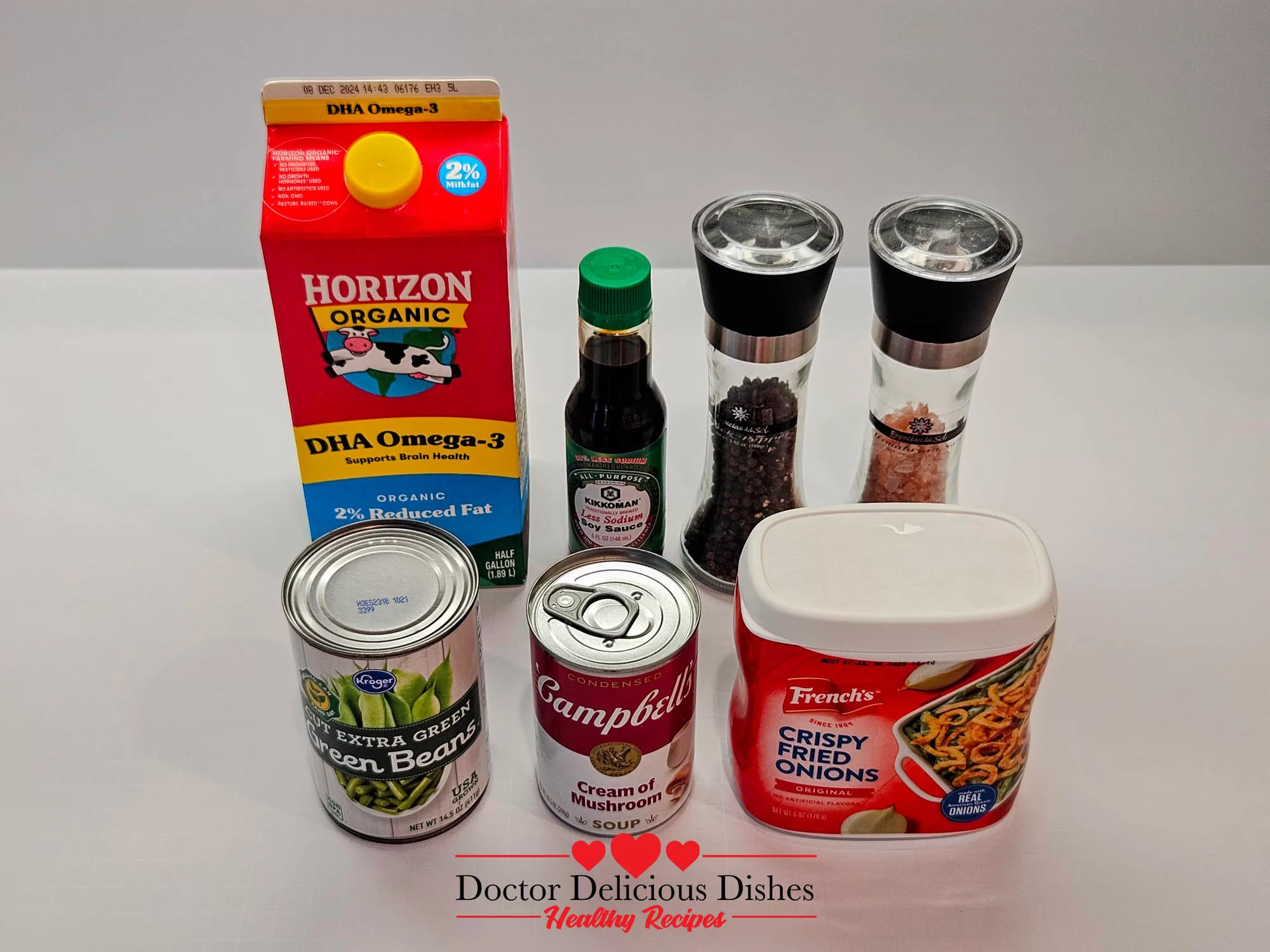 Gather your Campbell’s cream of mushroom soup, green beans, milk, soy sauce, pepper, salt, and crispy fried onions.