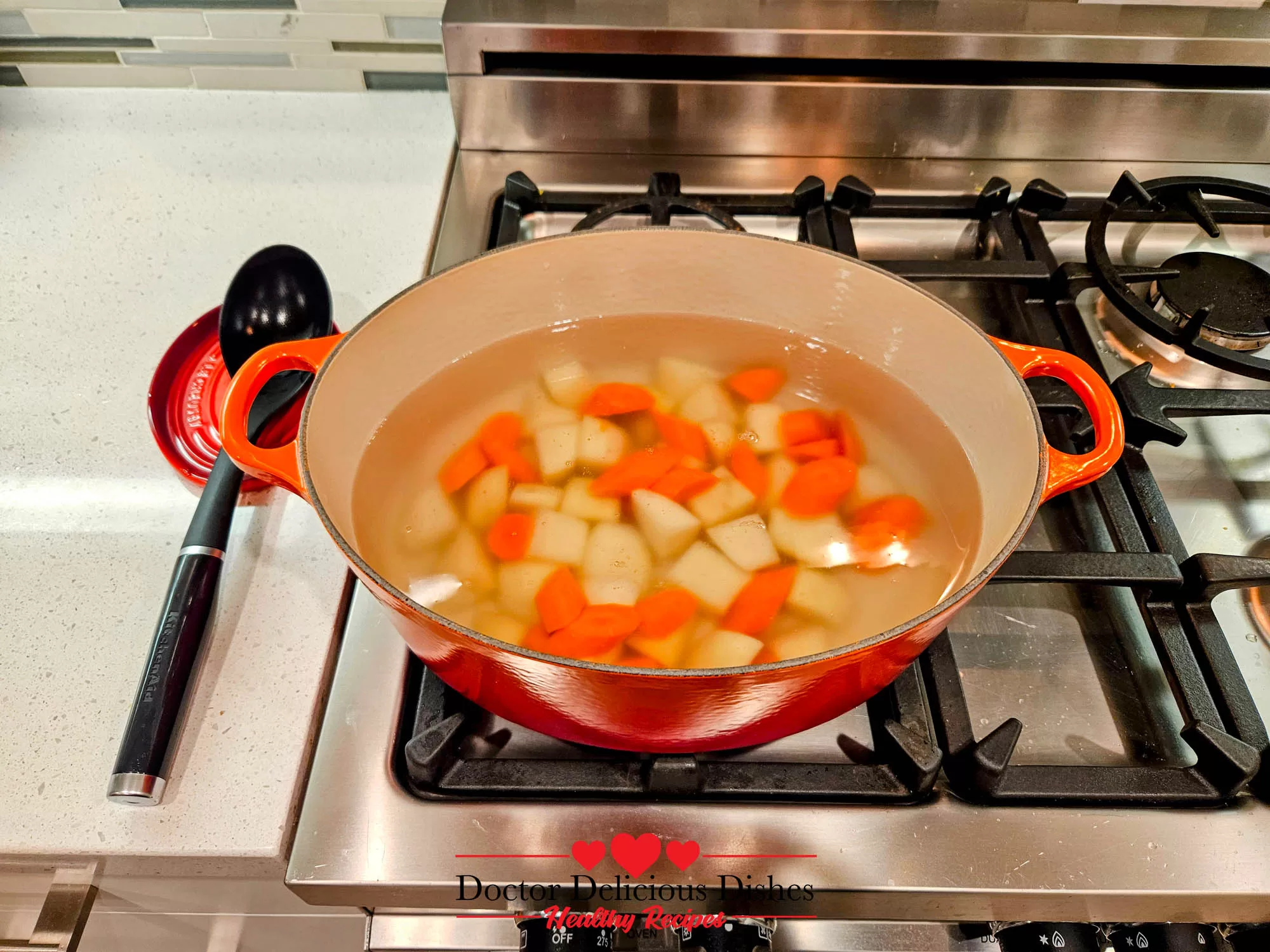 2. Boil the Veggies: In a large pot or Dutch oven, bring water to a boil. Add the cubed potatoes and carrots and cook until they’re just tender, which takes about 10 minutes. This step ensures they become perfectly soft to absorb all the delicious curry flavor later on.