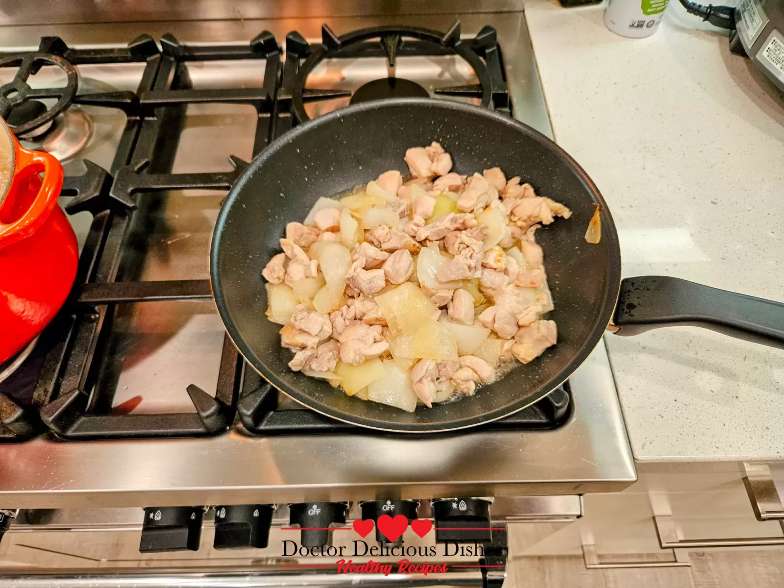 3. Sauté Chicken and Onions: 🔥 While the veggies boil, heat a touch of oil in a large skillet over medium heat. Add the diced chicken and chopped onions. Sauté them together, stirring occasionally, until the chicken is fully cooked and the onions are soft and translucent. Your kitchen should be smelling amazing right about now!