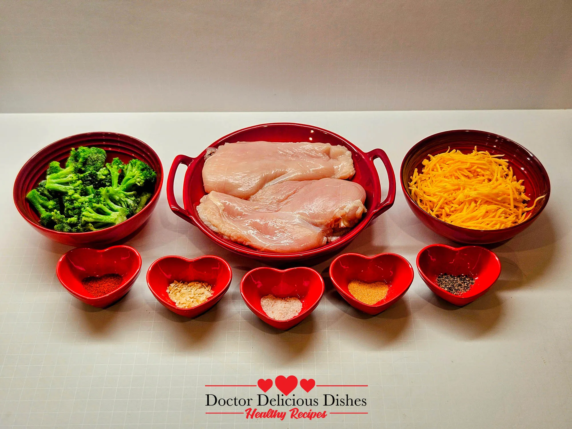 Lay out everything you need so the prep goes smoothly: chicken breasts, chopped broccoli, shredded cheddar, and seasonings. Having everything ready keeps this recipe fast and mess-free.