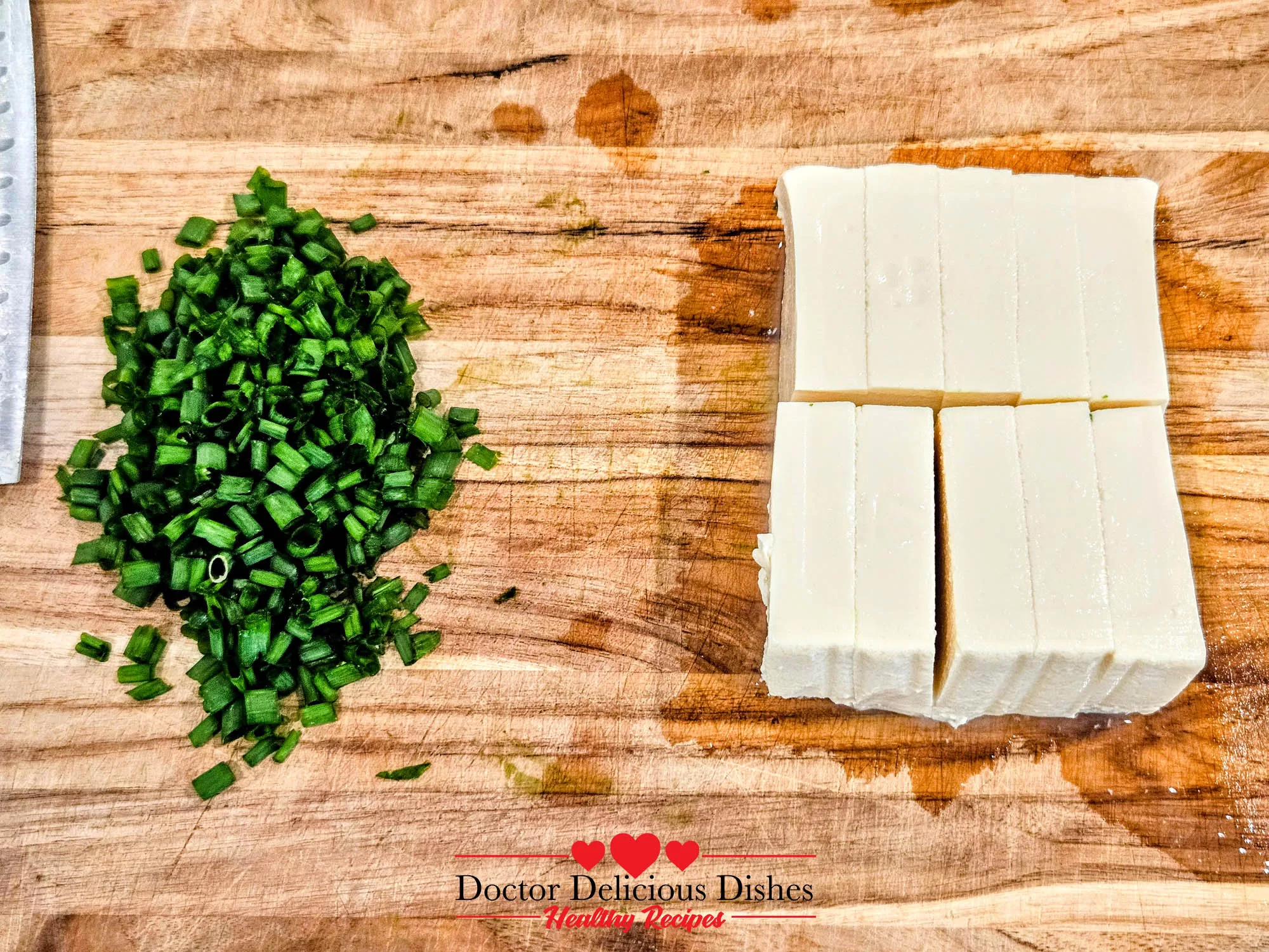 Carefully drain the soft tofu and place it on a cutting board. Using a sharp knife, slice it into even rectangles or squares, aim for uniform thickness so they cook evenly. Handle it gently (like a piece of silk!) to keep the tofu from breaking. Your chopped green onions are standing by to make it all pop with color later! 💚✨