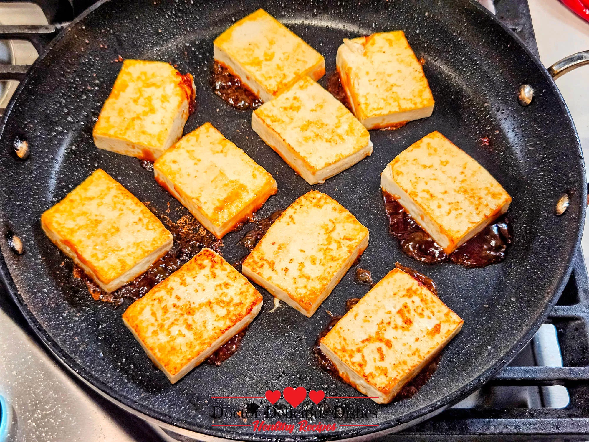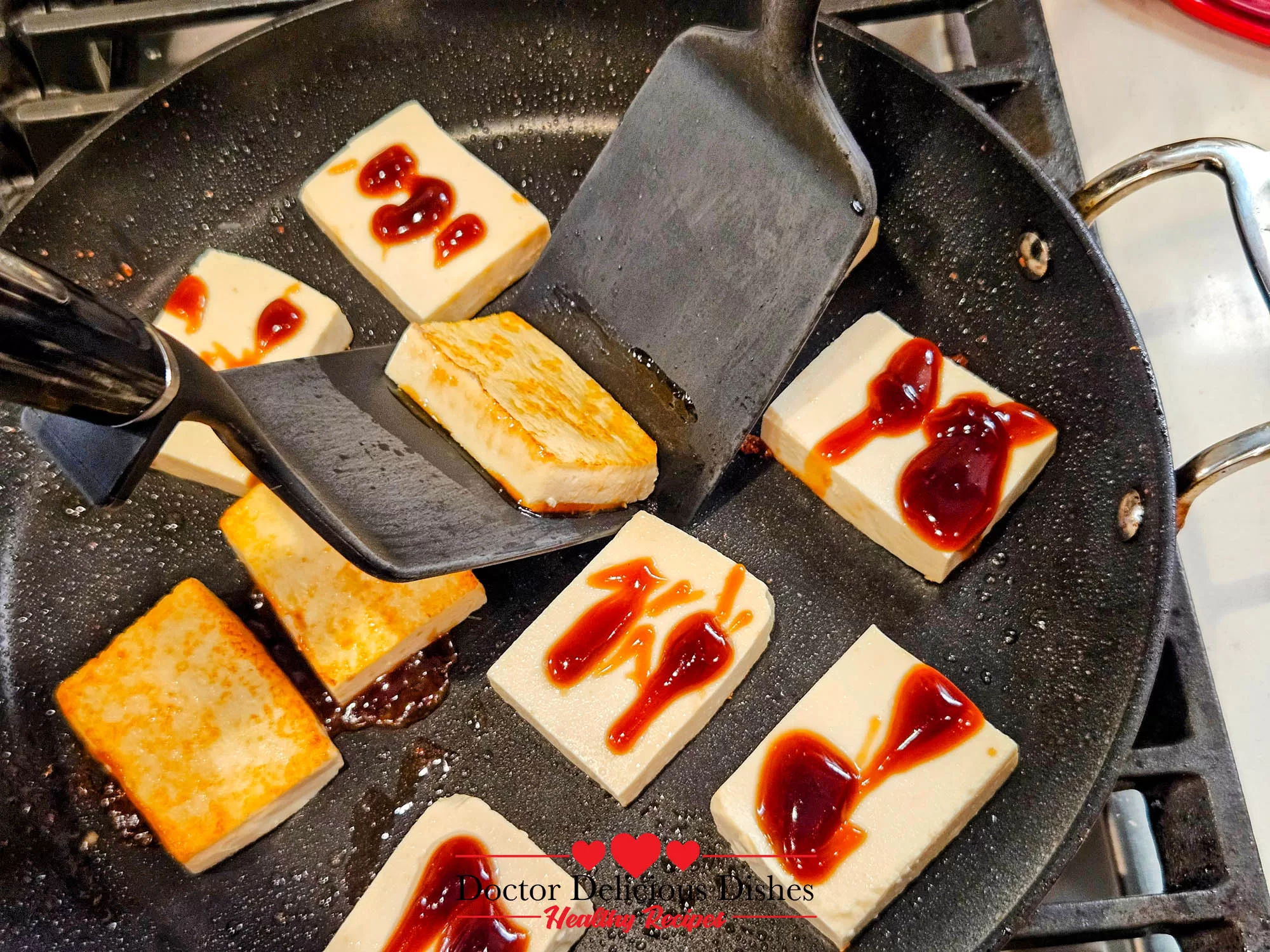 Use two spatulas to carefully flip the tofu and cook both sides until golden brown.